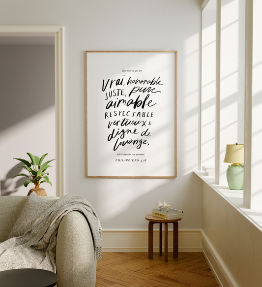 J’espère que chaque affiche, chaque mot, chaque verset que vous trouverez ici, vous rappelle que vous n’êtes pas seul~e. Que la foi peut s’inviter dans nos foyers, même dans le quotidien chaotique. Même au milieu du bruit, du linge à plier, ou des saisons de transition.