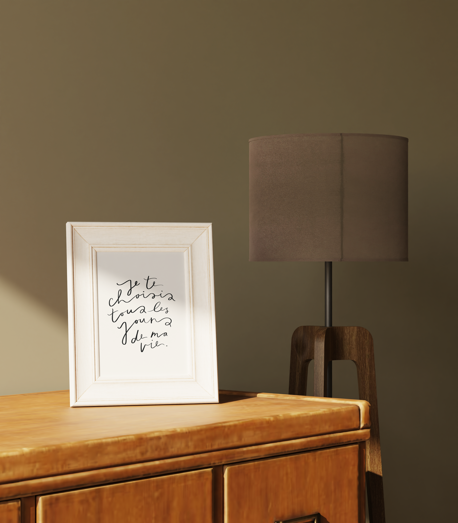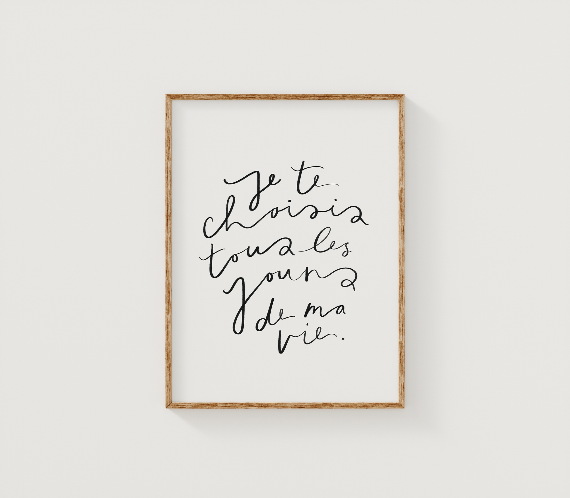 Une déclaration simple, mais remplie de profondeur : « Je te choisis tous les jours de ma vie ». Cette affiche a une signification double et précieuse : elle peut être l’expression d’un amour fidèle envers ton conjoint, ou un engagement renouvelé chaque jour envers Jésus. Avec son design minimaliste et élégant, elle s’intègre parfaitement dans un intérieur moderne tout en apportant une touche intime et spirituelle.