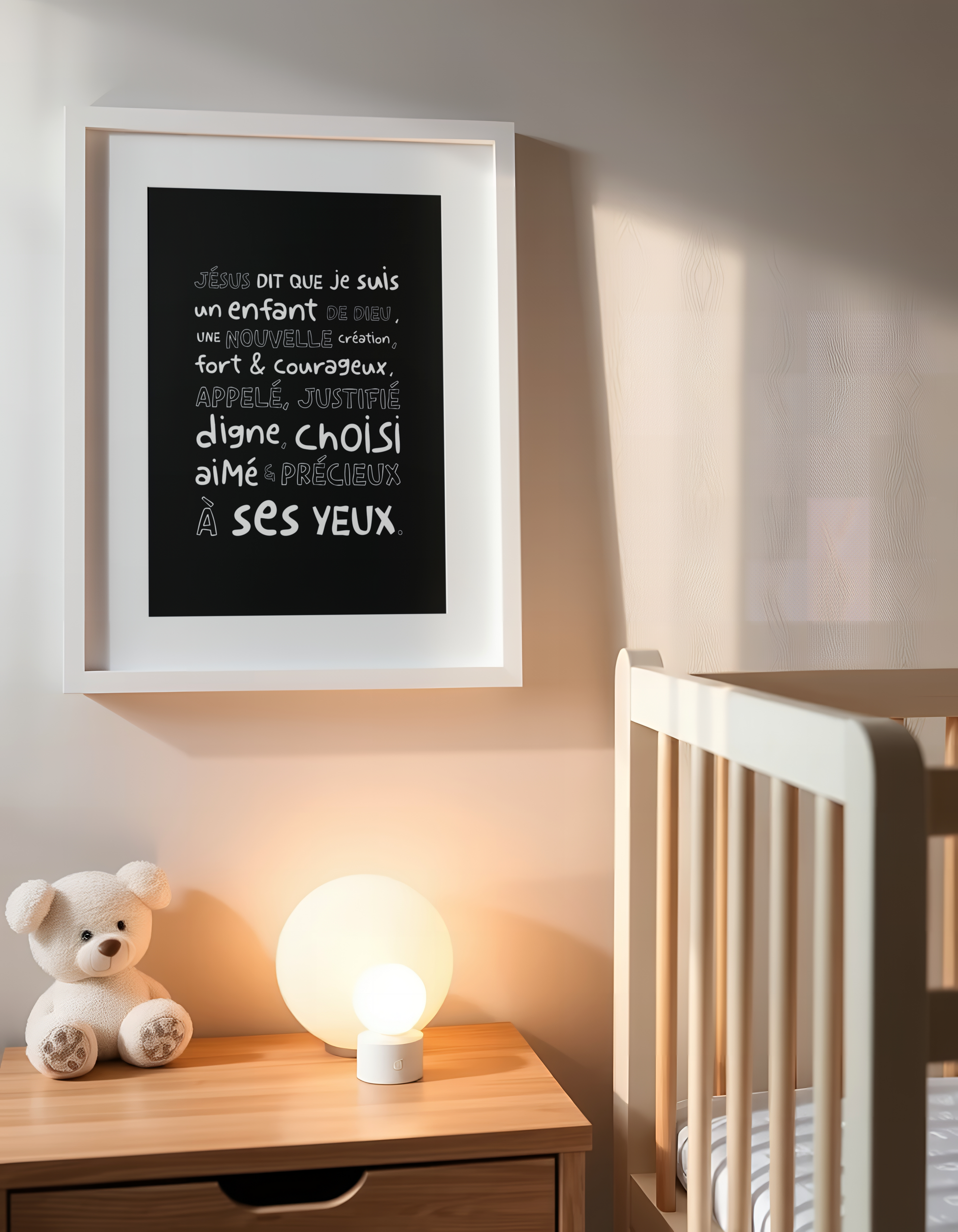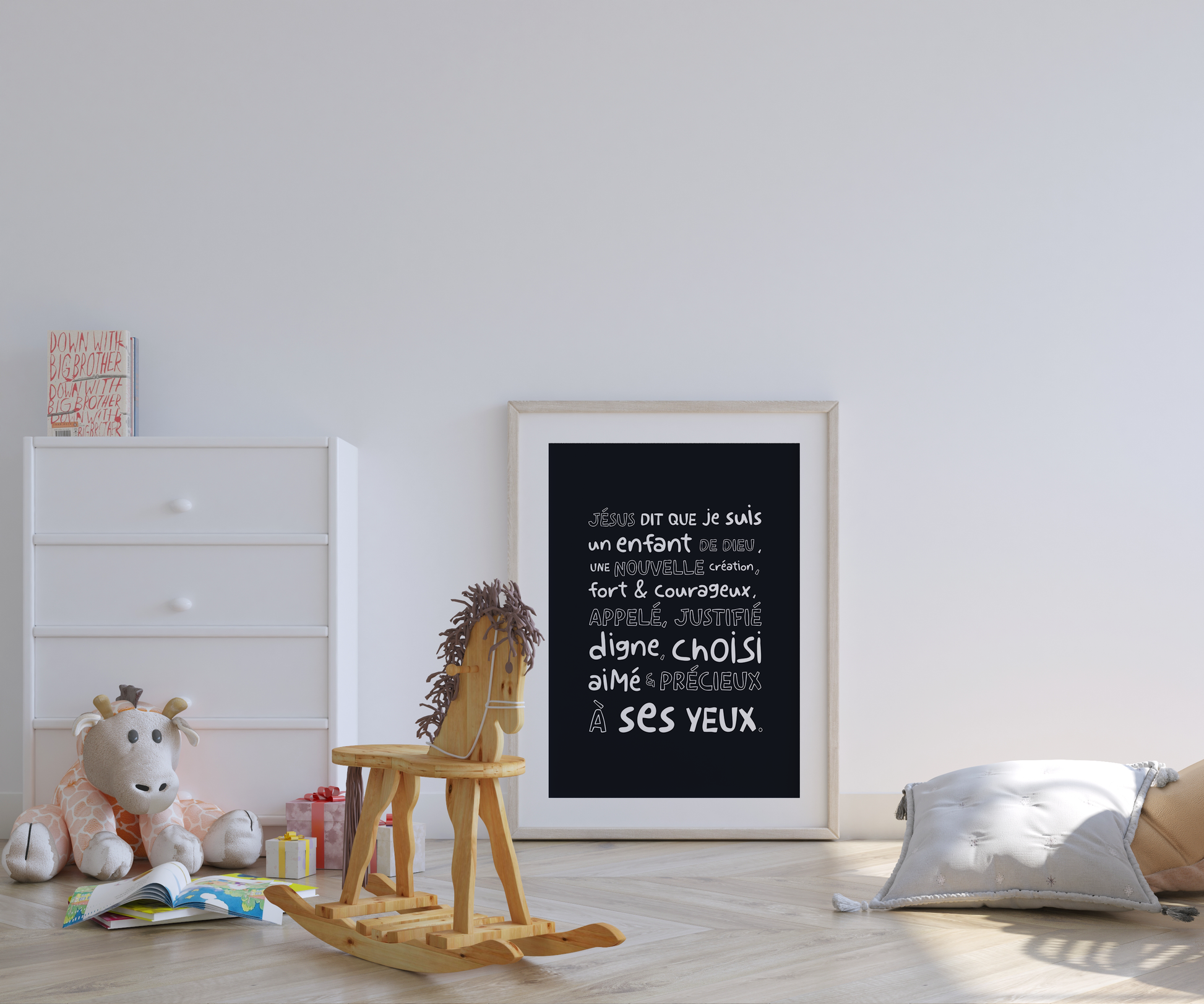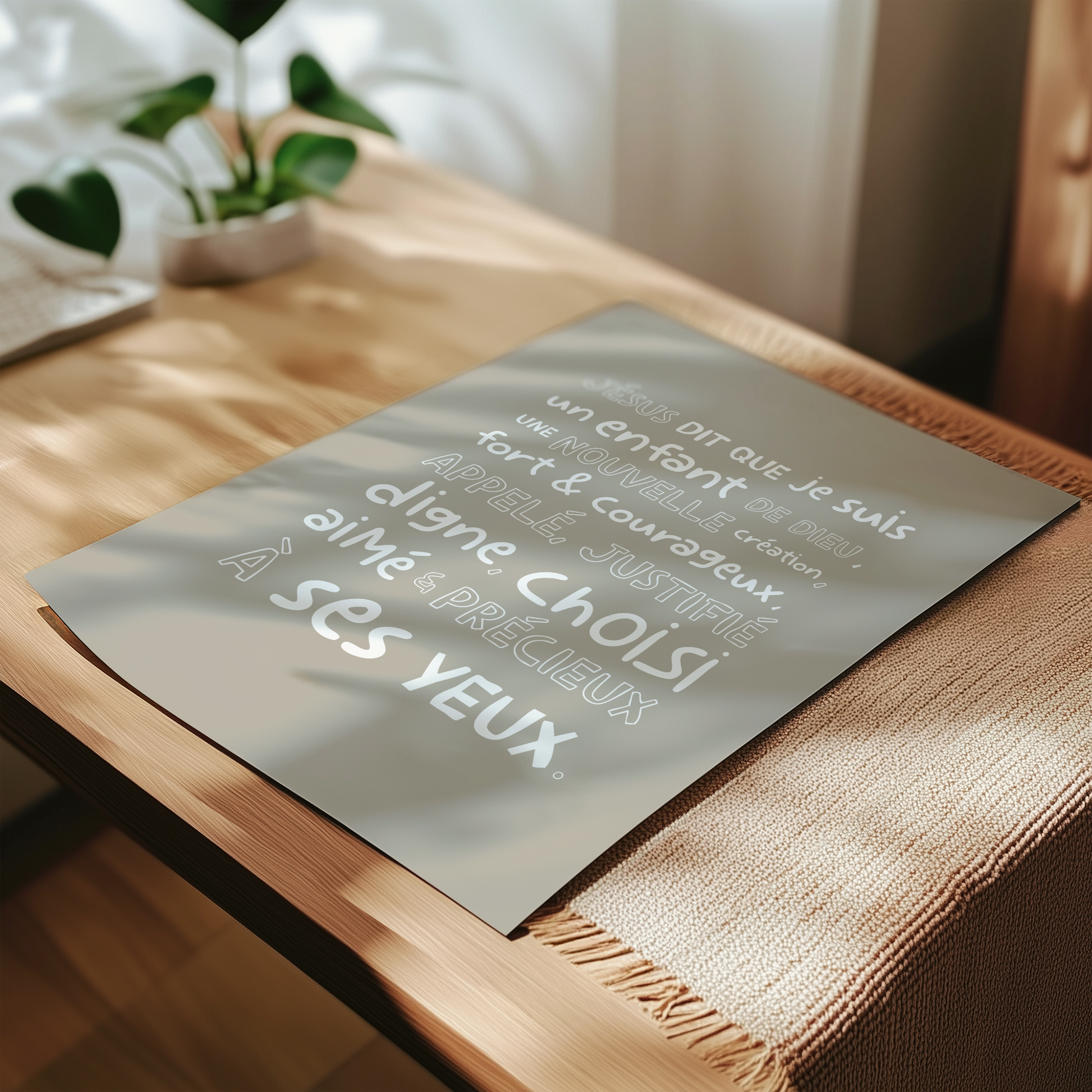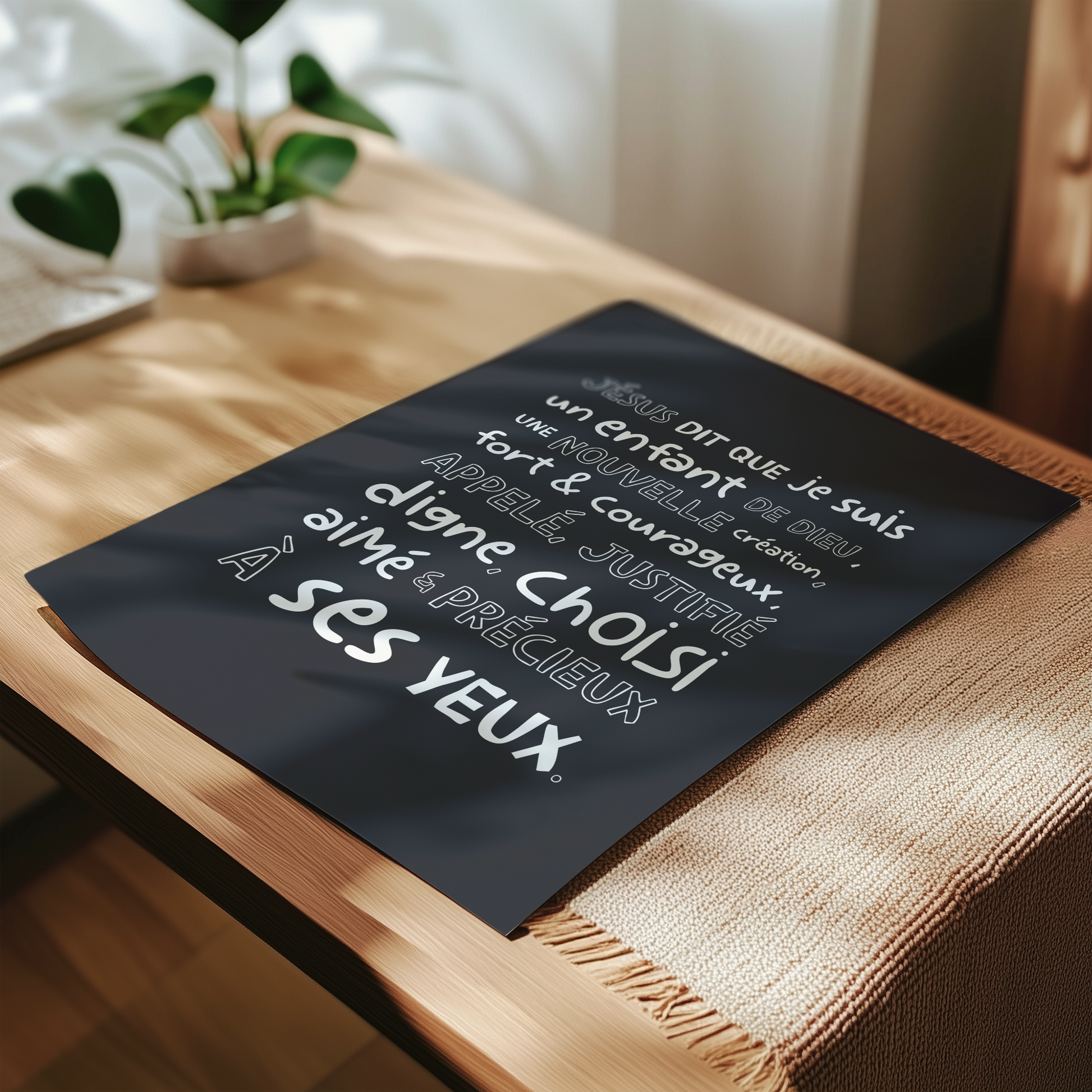 Cette affiche est un puissant rappel des vérités que Jésus déclare sur ta vie. Tu es enfant de Dieu, une nouvelle création, fort(e) et courageux(se). Tu es appelé(e), justifié(e), digne, choisi(e), aimé(e) et précieux(se) à Ses yeux.