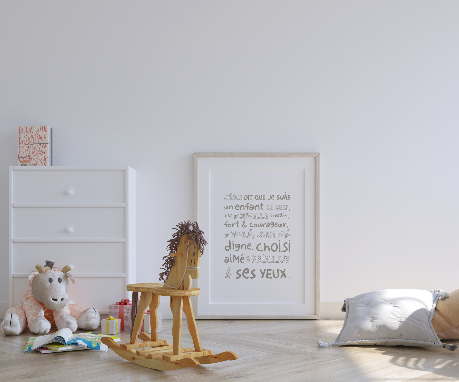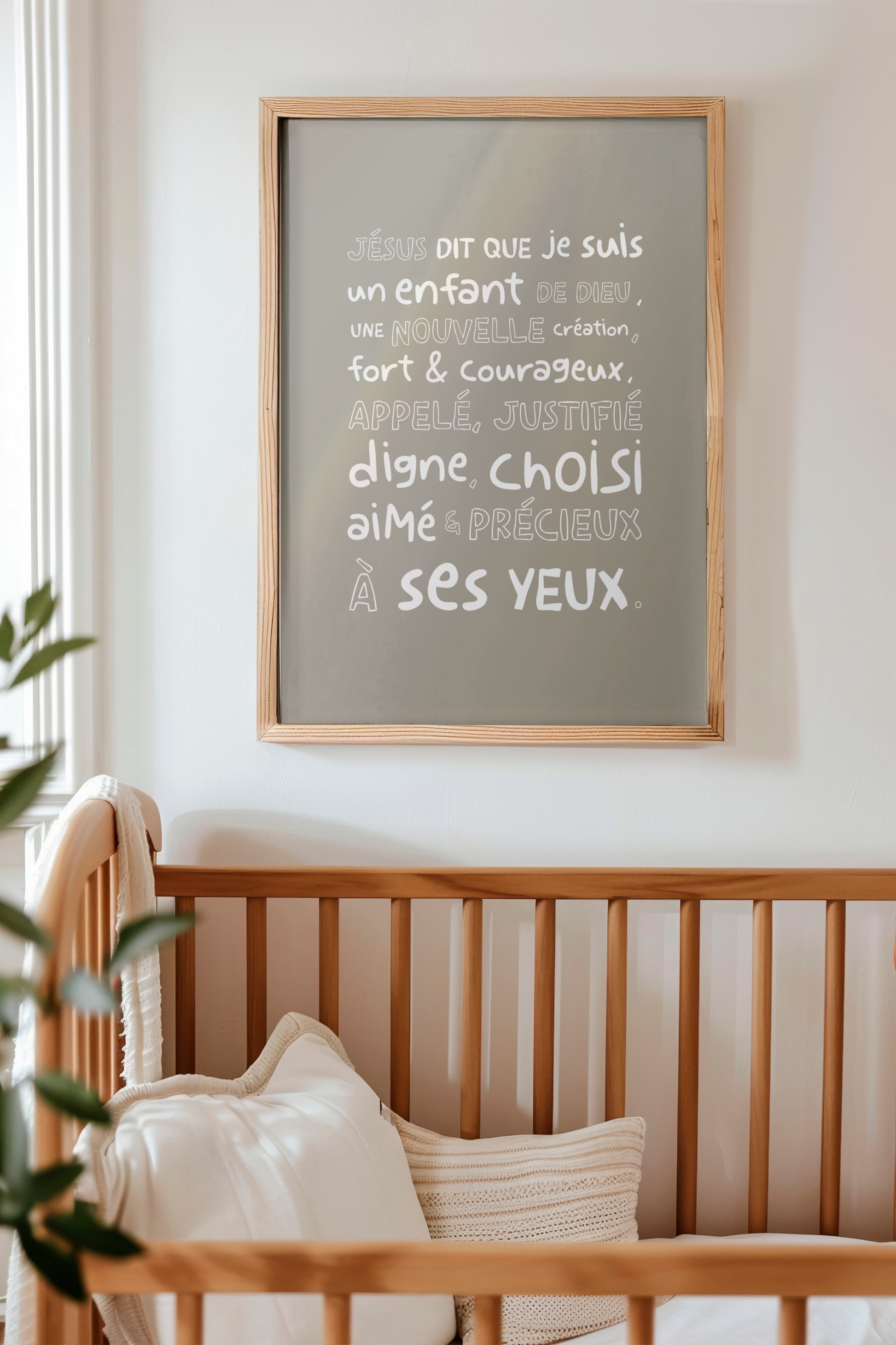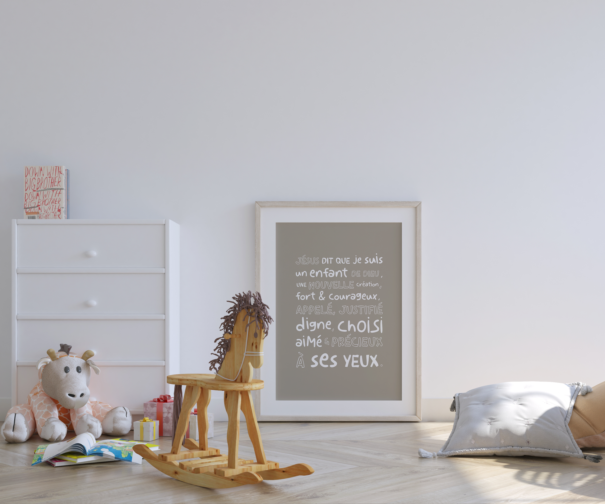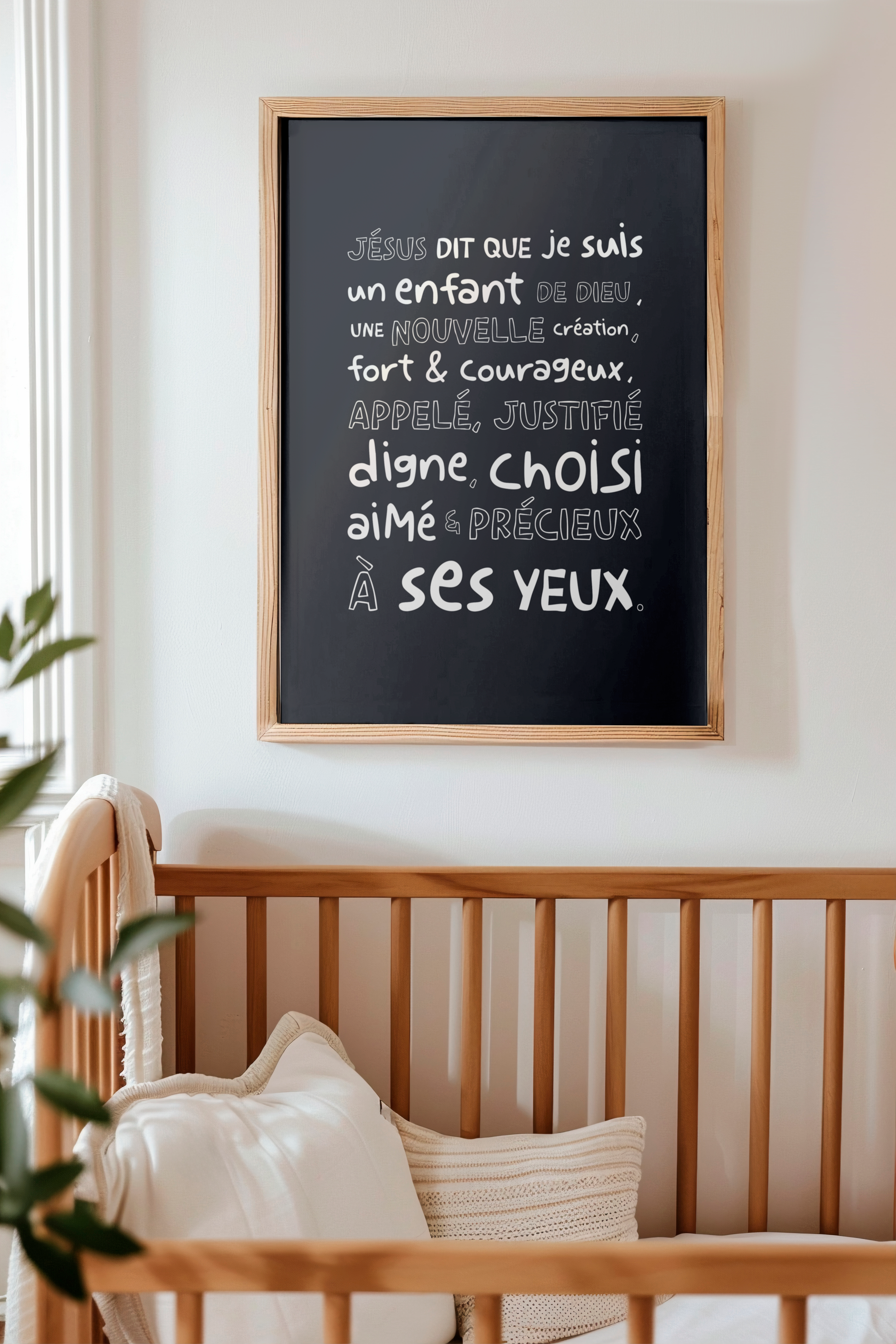 Cette affiche est un puissant rappel des vérités que Jésus déclare sur ta vie. Tu es enfant de Dieu, une nouvelle création, fort(e) et courageux(se). Tu es appelé(e), justifié(e), digne, choisi(e), aimé(e) et précieux(se) à Ses yeux.