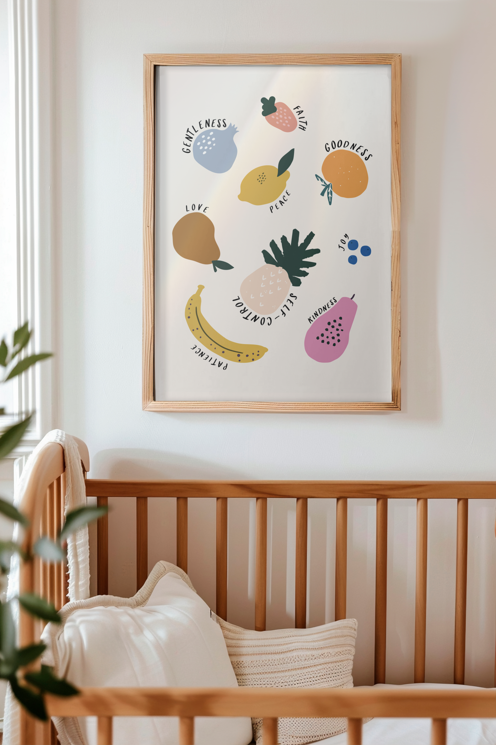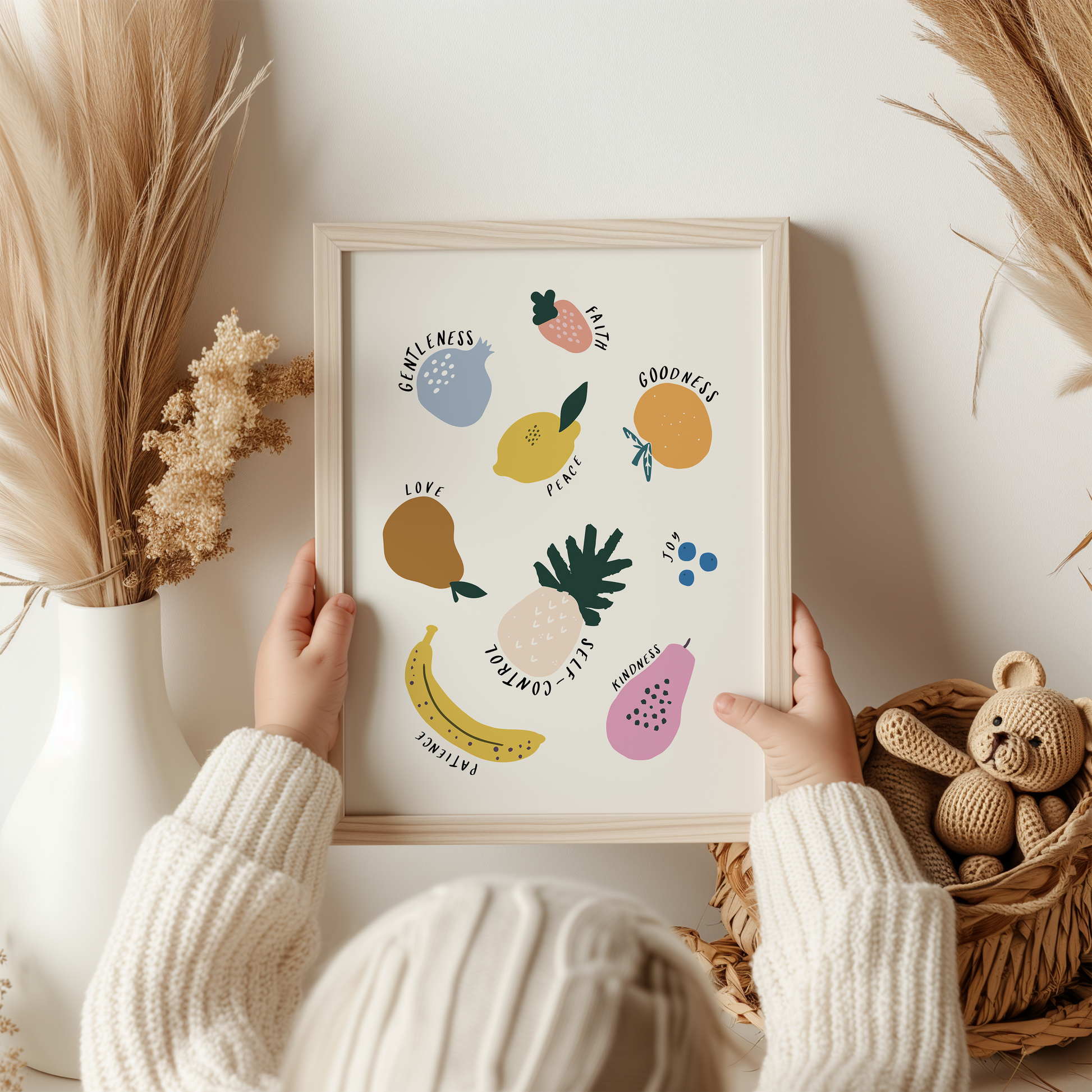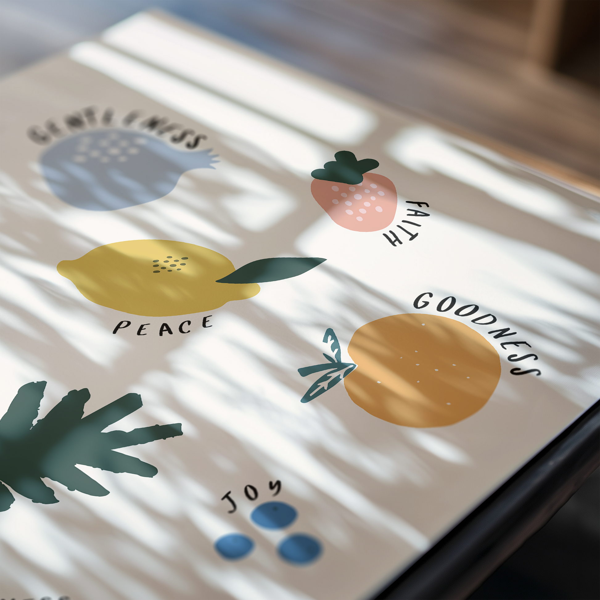 This colorful and modern print illustrates the nine fruits of the Spirit mentioned in Galatians 5:22-23: love, joy, peace, patience, kindness, goodness, faithfulness, gentleness, and self-control. With its vibrant tones and playful shapes, it brings a joyful touch to your home while serving as a daily reminder of the Holy Spirit’s work in our lives.