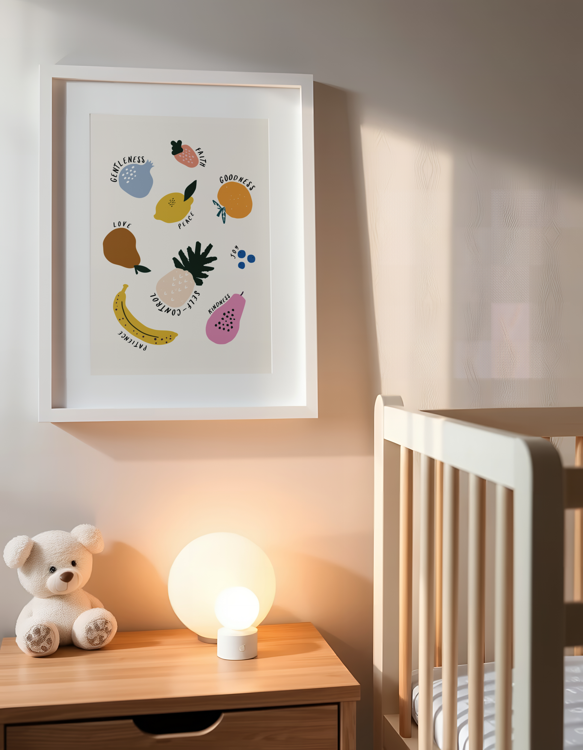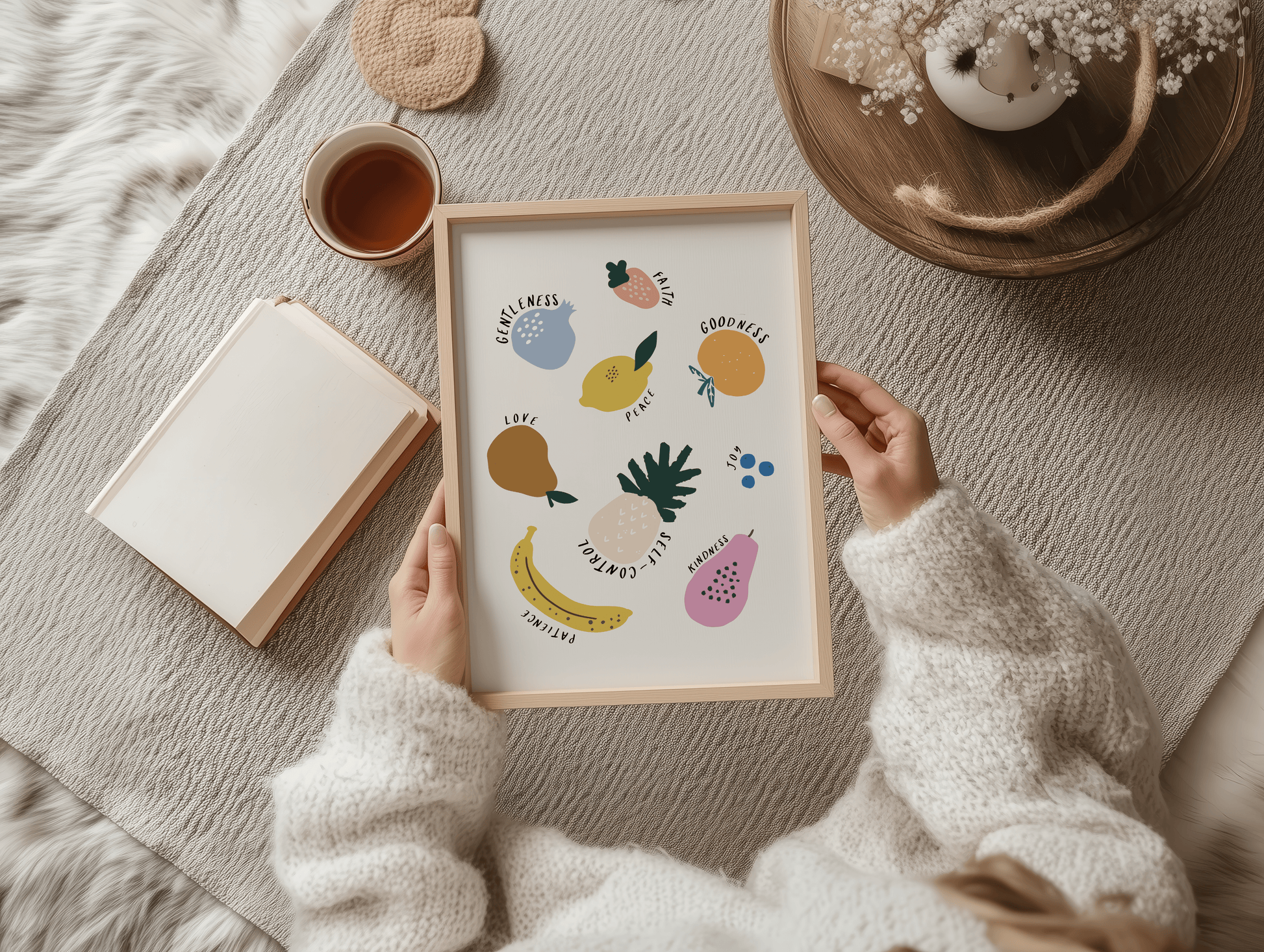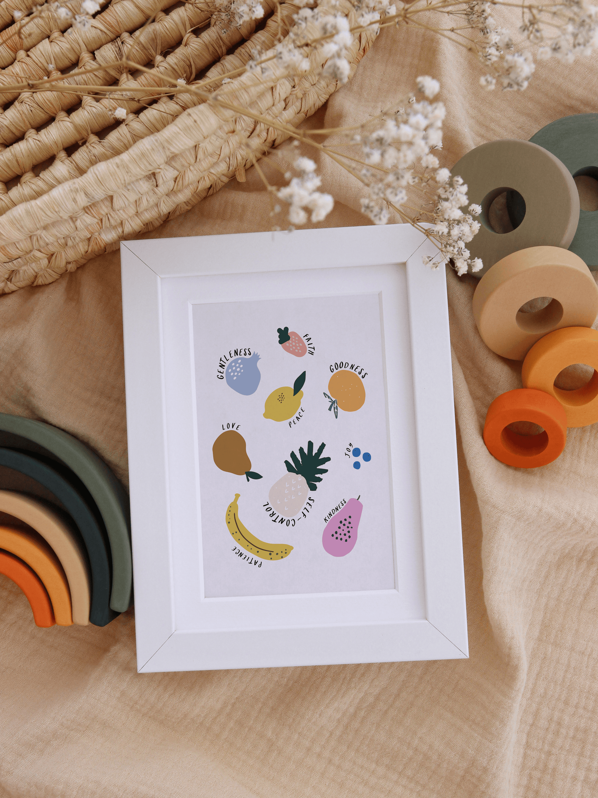 This colorful and modern print illustrates the nine fruits of the Spirit mentioned in Galatians 5:22-23: love, joy, peace, patience, kindness, goodness, faithfulness, gentleness, and self-control. With its vibrant tones and playful shapes, it brings a joyful touch to your home while serving as a daily reminder of the Holy Spirit’s work in our lives.